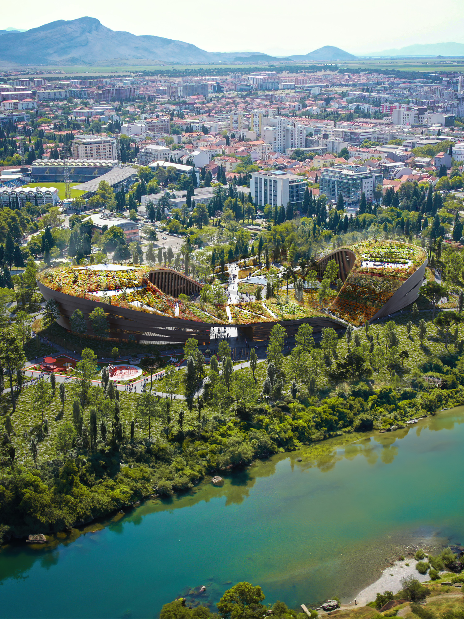 The Museum Citadel project was conceived for an international competition for the construction of a new museum and cultural complex in the heart of the city of Podgorica. The area, which currently lacks a strong architectural identity, is rich in natural beauty and landscape: it is this characteristic that shapes the entire project. The masterplan includes three main buildings – the Museum of Contemporary Art, the Natural History Museum and the House of Architecture – together with a Botanical Garden and a large public park. The project is based on an architectural concept that interprets and enhances the natural lines of the territory: the buildings do not impose themselves on the landscape but emerge from the ground as natural extensions of the existing park, delicately nestling among the trees, all of which have been preserved or replanted. The complex is developed in a ring shape, conceived as a real 'building-pathway'. This ring opens and closes in the park, creating a new urban agora: a space for meeting, culture and sharing. The project is united by a large continuous green roof, which is both symbolic and ecological. The roof envelops the three museums and creates a recognisable silhouette, blending nature, architecture and culture into a single architectural feature. Great attention has also been paid to the visitor experience: the Museum of Contemporary Art offers flexible exhibition spaces, equipped with advanced technologies and enhanced by natural light; the Natural History Museum offers an immersive and sensory journey dedicated to Montenegro's biodiversity, with organic displays and interactive installations; the House of Architecture, overlooking the Morača River, becomes a dynamic centre for debate, research and training on contemporary architecture. A project designed to welcome, inspire and create new connections, thanks to a ring shape that blends into a single, recognisable architectural landmark, capable of uniting space and nature.