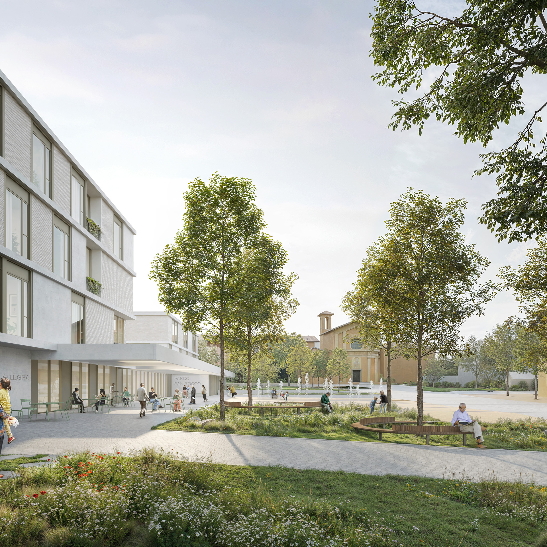 The project proposal for Parco San Rocco in Morbio Inferiore, Switzerland, goes beyond the traditional model of medicalised residential care for the elderly, proposing an intergenerational neighbourhood where care, socialising, landscape and urban life intertwine in an open and inclusive system. The project is located along the southern edge of the historic centre, between the town hall, the church of San Rocco and the Breggia valley, transforming a marginal location into an urban threshold between the city and nature. A new multifunctional public square becomes the civic heart of the project, a place of access and encounter for residents, visitors and citizens. The masterplan consists of two residential buildings connected by a low, transparent volume, which links the two main levels of the lot and houses collective and public functions. The project is designed as an ecological and social infrastructure, integrating a public park, therapeutic gardens and accessible green spaces. From a functional point of view, the complex organises public spaces, services and residential areas: the square also houses a civic centre open to the community, while the housing units, organised into small clusters, offer a flexible and recognisable domestic environment.