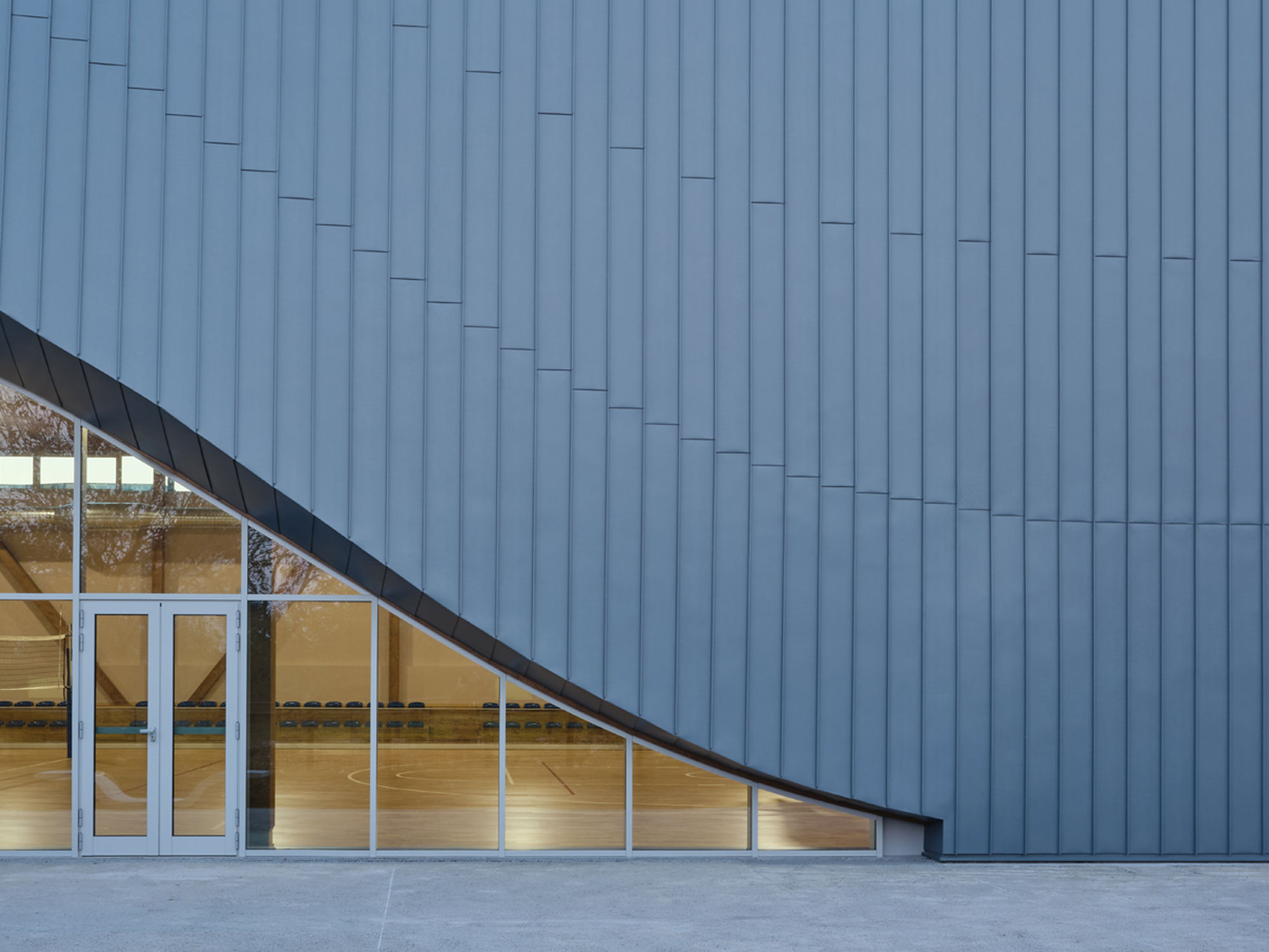 La palestra si compone di due campi di gioco progettati con flessibilità per adattarsi alle diverse esigenze, una tribuna dedicata agli spettatori e un ingresso diretto riservato al pubblico. Gli interni di questo ambiente sono definiti e ritmati dalle controventature in legno lamellare a vista, che trasformano la struttura portante in un elemento di design oltre che funzionale.